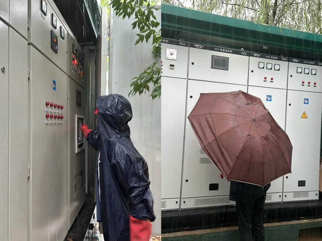 晟威信息公司喻寄庵、黄彬、王在兴等人冒雨逐一检查各个充电站电路情况,在排除积水影响、全站检查后,对湘府文化公园、港子河充电站恢复供电。