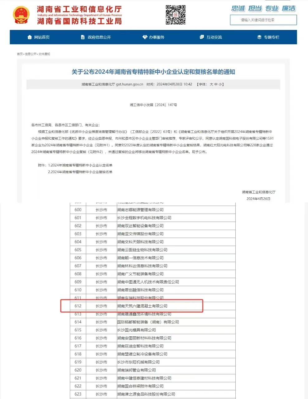 近日,湖南省工业和信息化厅公布“2024年湖南省专精特新中小企业名单”,月博集团子公司湖南天筑六建混凝土有限公司凭借其在行业科技领域的卓越贡献与创新实践荣列其中,成为湖南省“专精特新”中小企业的一员。