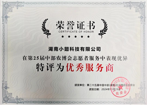 2024年5月,“小翅侠”志愿者服务团队首次在2024年“机甲大师超级对抗赛上”亮相,获得了主办方、指导单位及政府对“小翅侠”志愿者服务团队优质服务的高度认可与赞誉。2024年11月,“小翅侠”志愿者服务团队亮相“第25届中国中部(湖南)农业博览会”,再次以优质服务获得了各方的高度认可与赞誉,并被组委会评选为“优秀服务商”的荣誉称号。这不仅是对“小翅侠”志愿者团队的肯定,更是对志愿者们青春担当的认可。