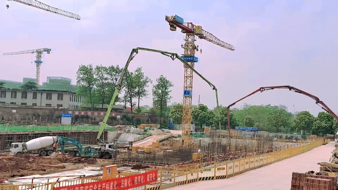 在项目施工现场,混凝土罐车往来穿梭,泵车长臂挥舞,施工人员分工明确、紧张有序地进行着各项作业。为确保首块底板的顺利浇筑,天筑六建公司提前组织技术人员进行方案论证和交底,对原材料质量、混凝土配合比等严格把关。在浇筑过程中,安排专人全程盯控,及时协调指导施工作业,保障了浇筑工作的连续性和稳定性。
