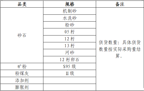 本次征集活动为2024年度第一次原材料供应商的征集,征集供应商品类为:砂石、水泥、粉煤灰、矿粉、膨胀剂、减水剂、外加剂等,现每年总需求约200万吨。